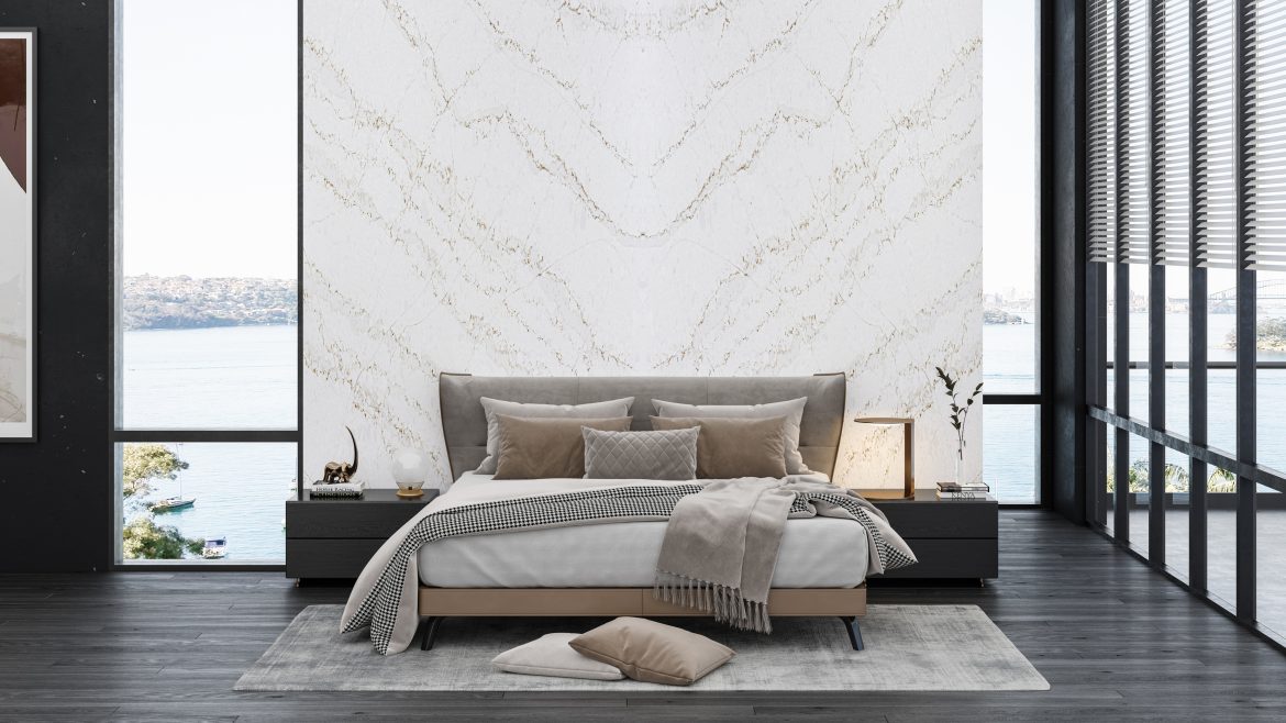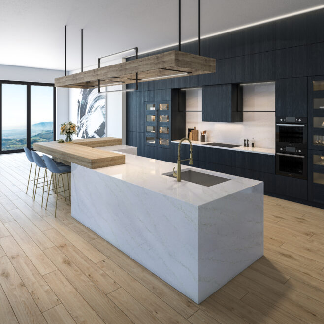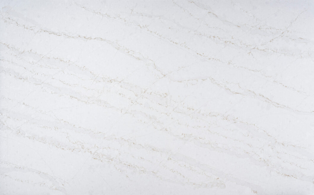Our Atmos Gold® quartz design offers delicate veining of white and beige streaks across a soft muted surface, evoking the gentle movement of clouds in a serene sky.