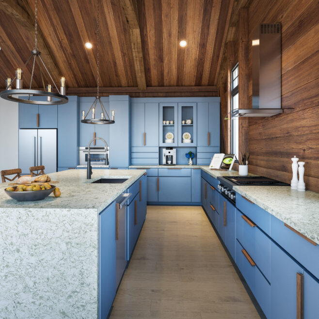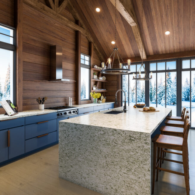 Envision our Celadon quartz slab characterized by its distinctive green glaze, translucent with ranges in colors from pale to grayish-green in a refined pattern.