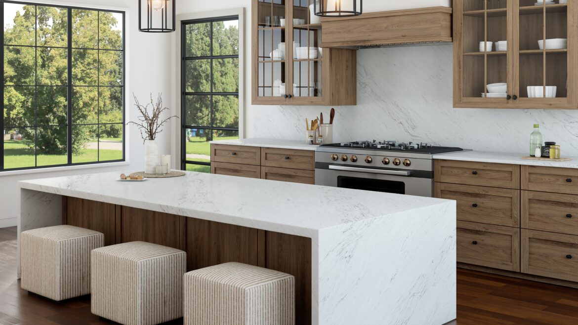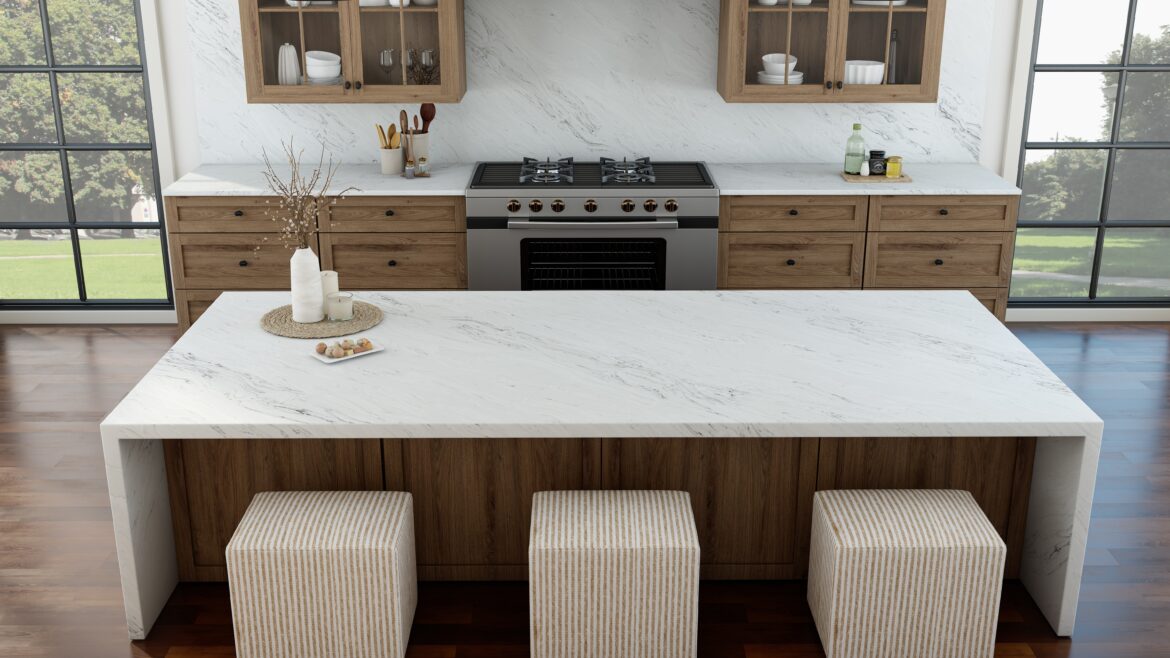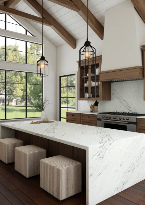 A pristine white surface dramatically accented by a long, thin taupe vein. This elegant quartz design offers a modern, minimalist aesthetic with a subtle touch of warmth, creating a sophisticated and versatile stone perfect for contemporary spaces.