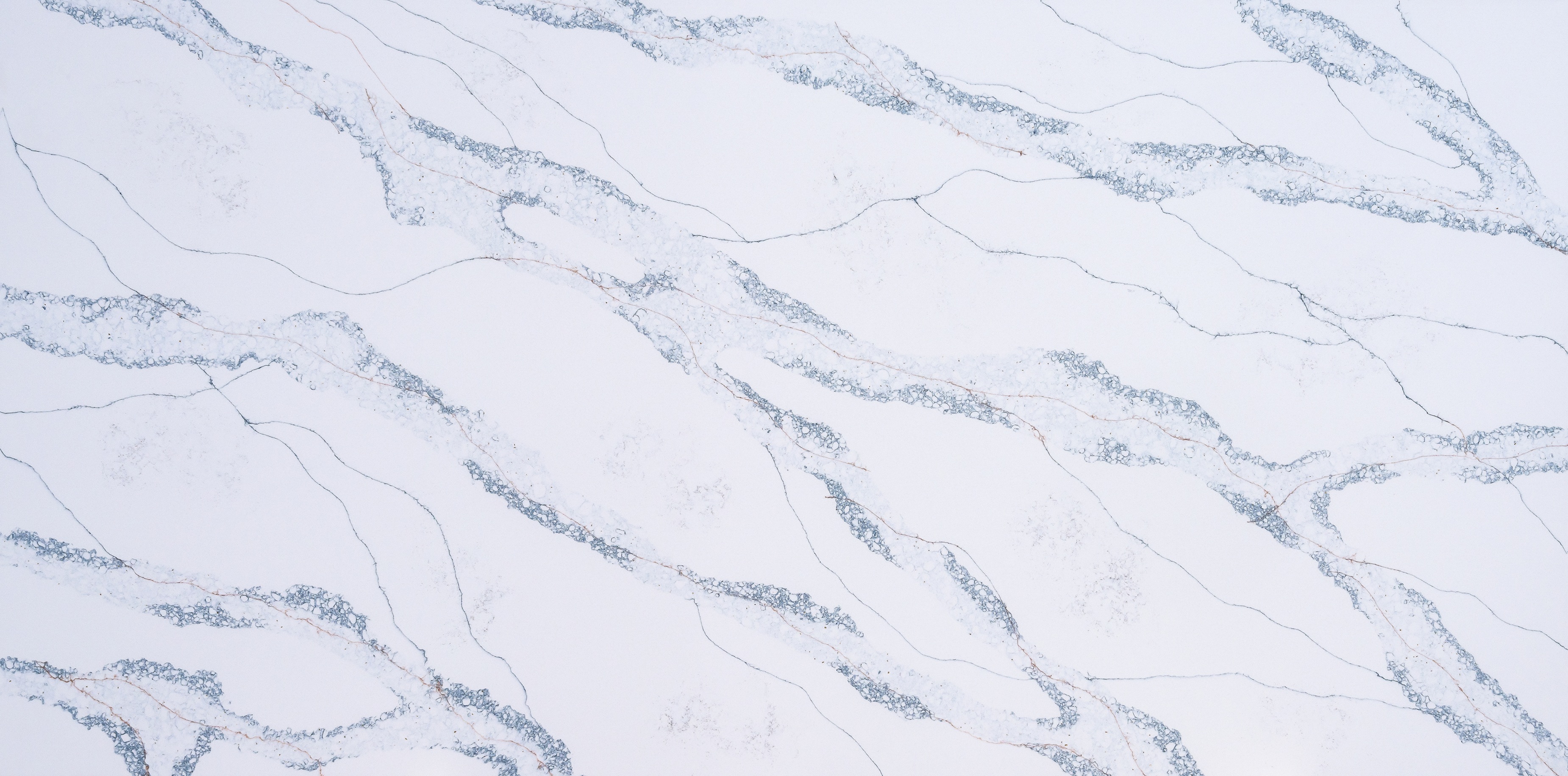 Malana features iridescent blue veins alongside thin veins of deep rust and steel blue, all moving in an organic, fluid pattern. The subtle, misty cloudy background enhances the bold, dynamic statement.